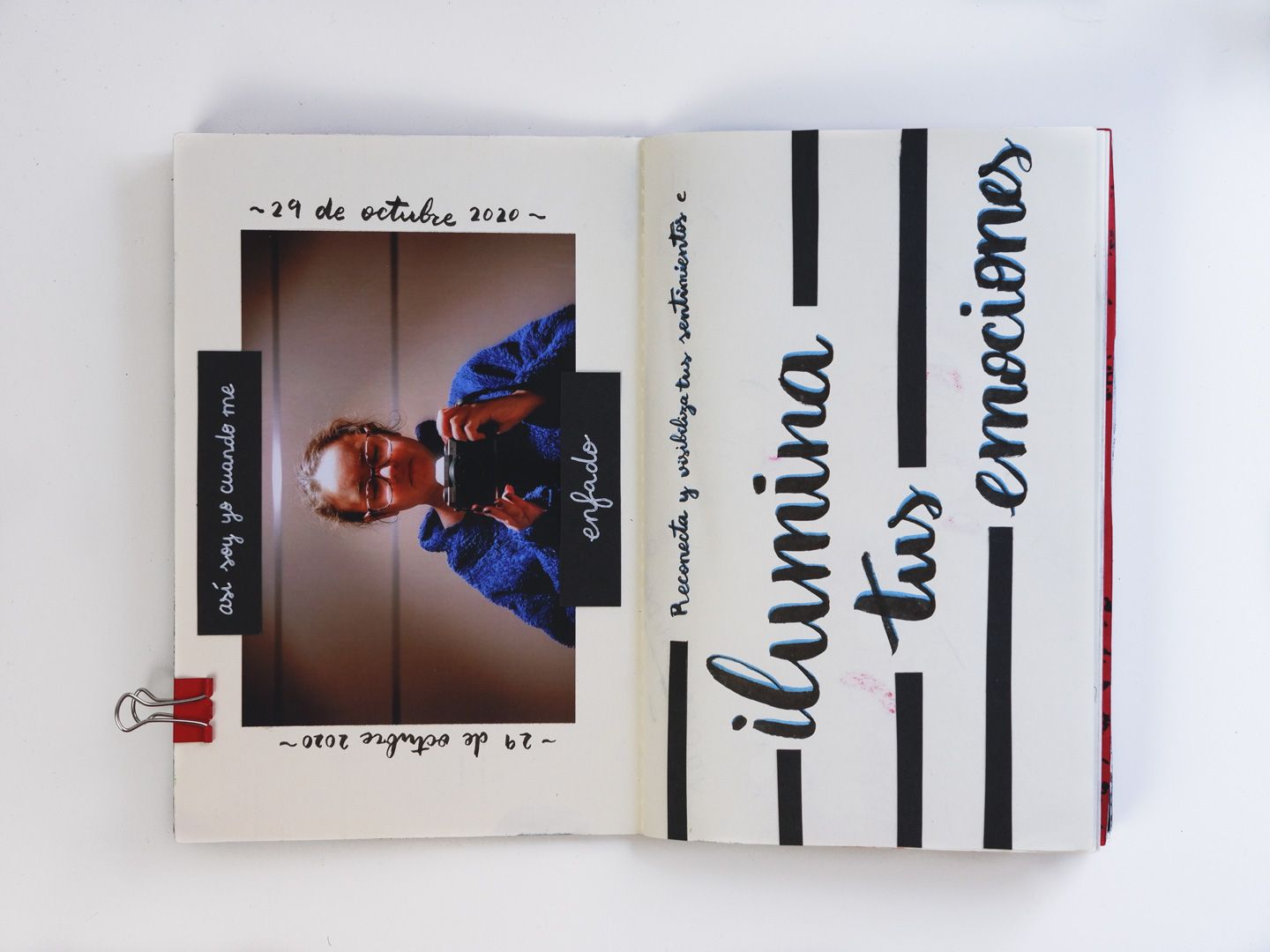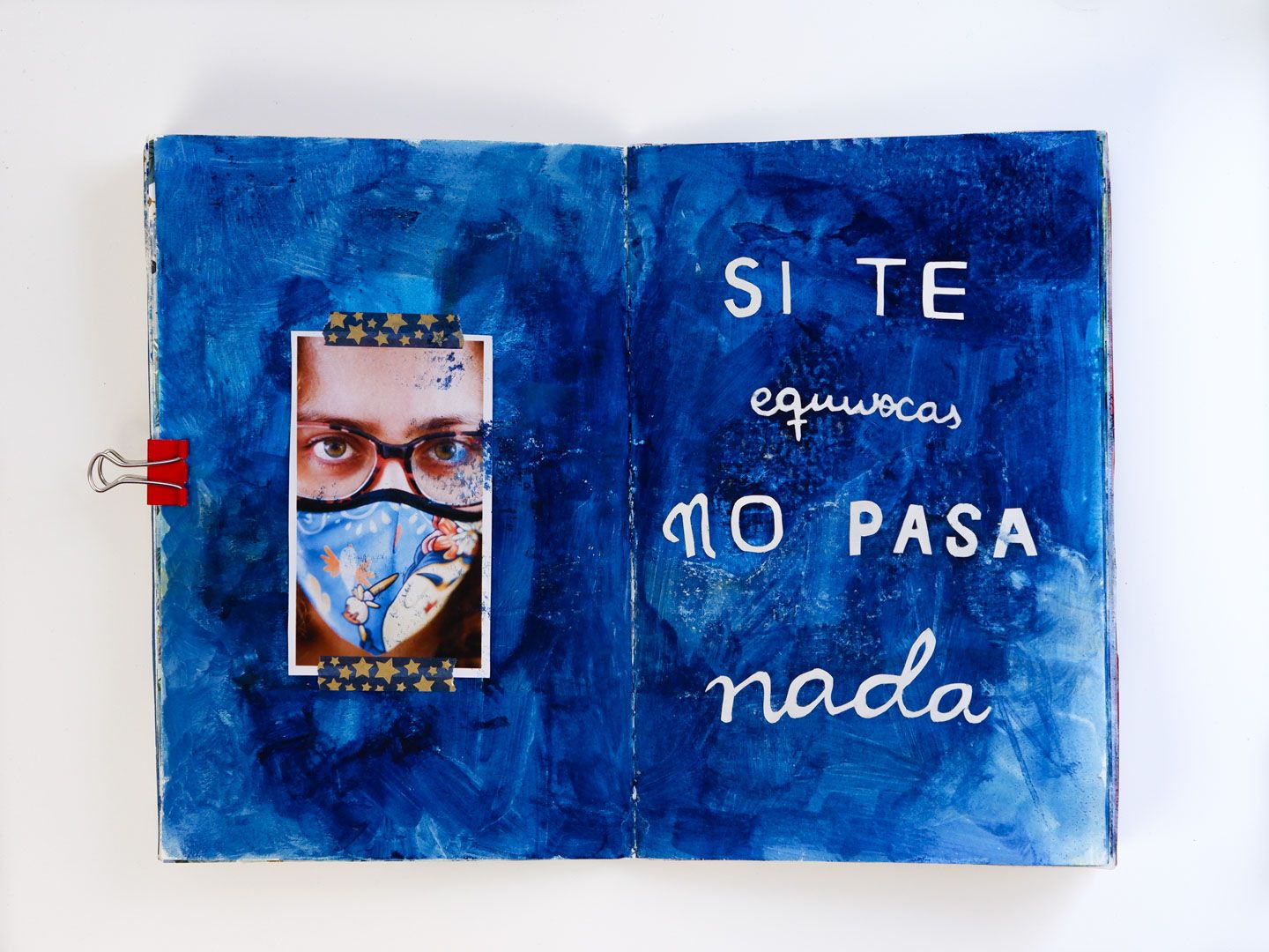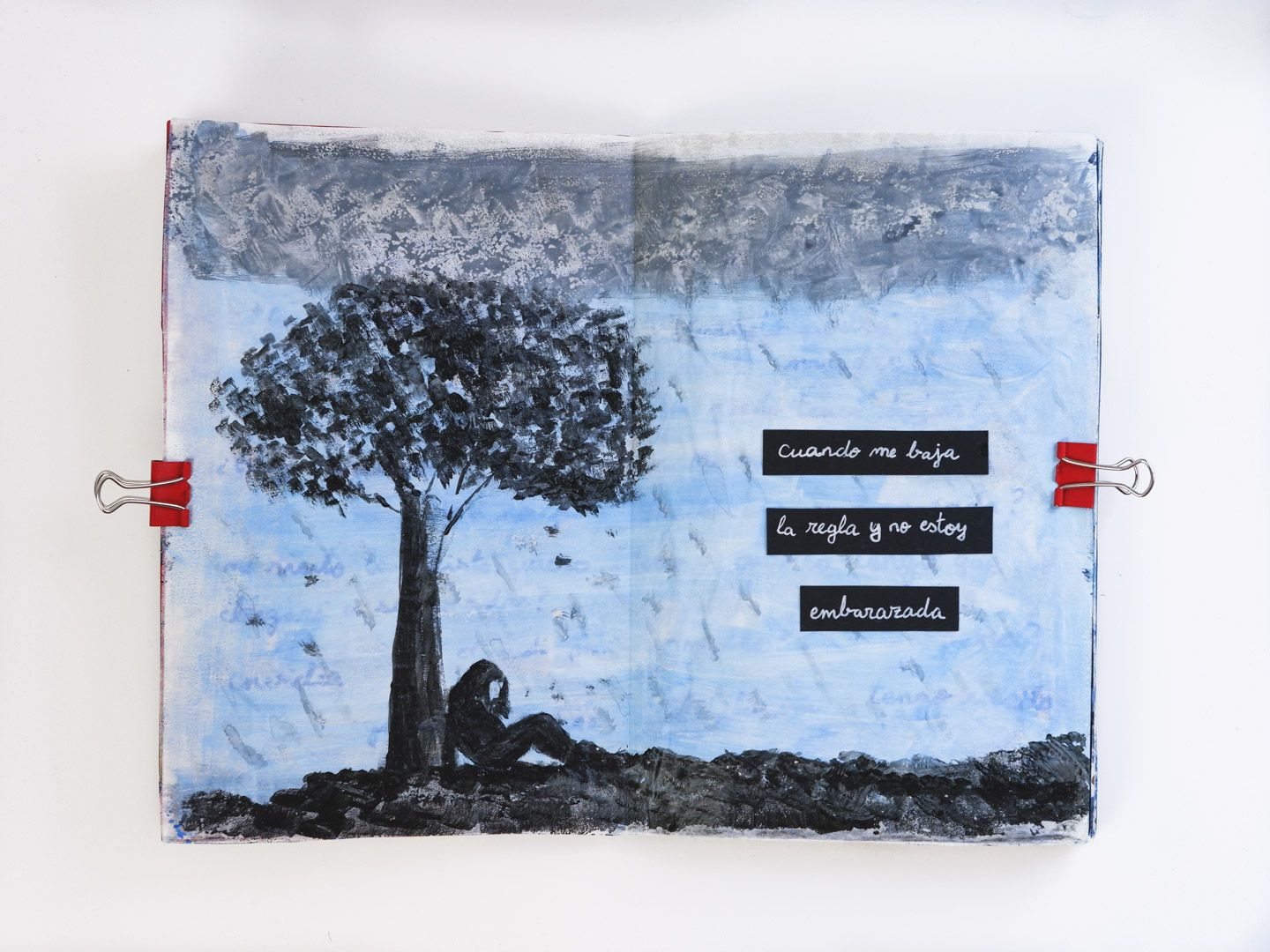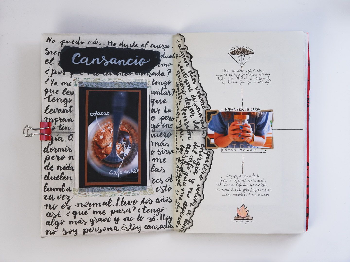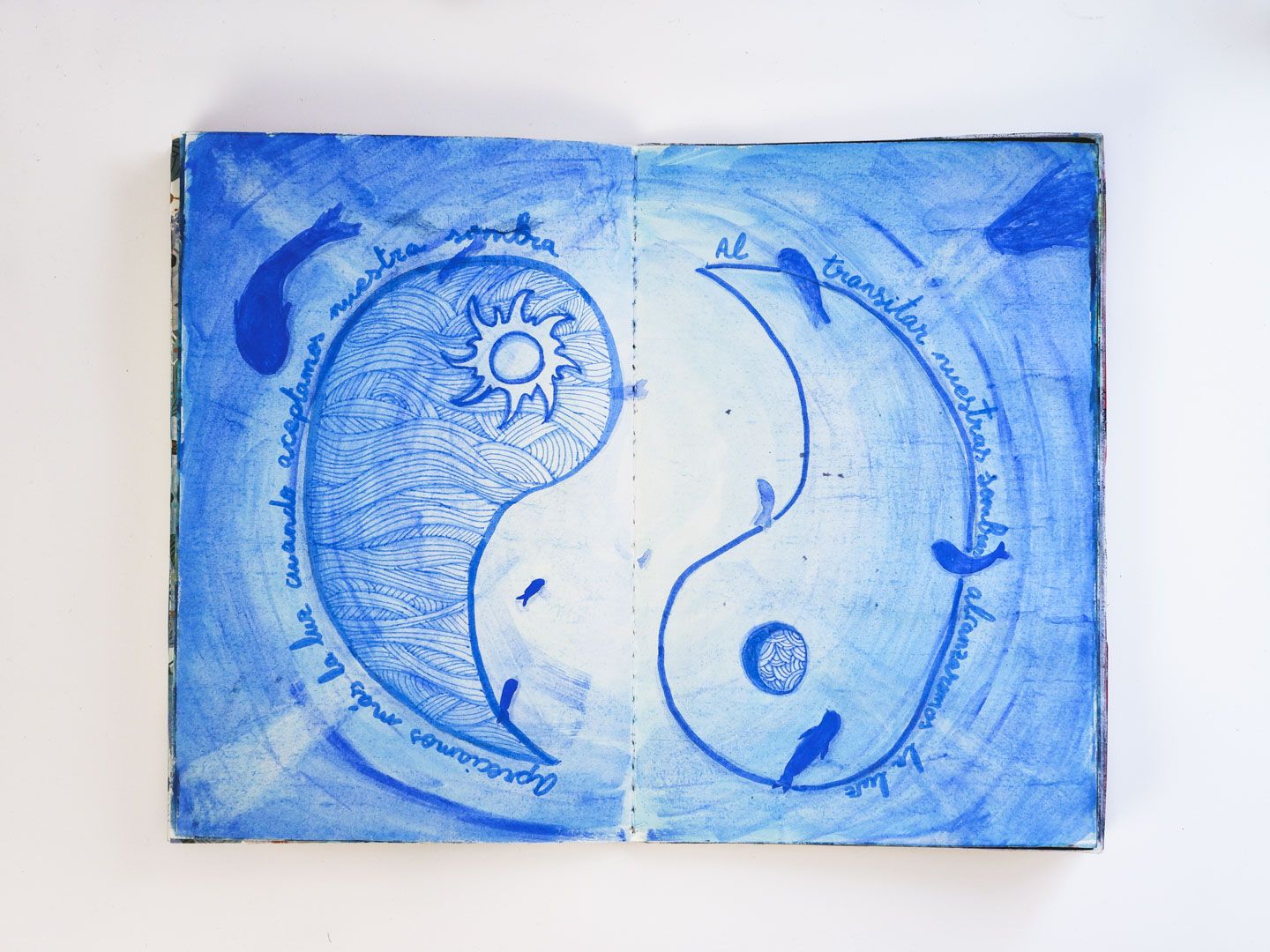 Esta es una obra de autoconocimiento y exploración. Este diario es el resultado del taller de Diarios Creativos de Tam Castrillejo. Gracias a este taller comencé a explorar y conocer cuáles son mis luces y mis sombras. Cada página tiene su historia, especialmente las de la sombra, que son la condensación de mis aprendizajes y emociones en Terapia. El principio del diario (la luz) comienza con los ejercicios propios del taller…y he de admitir que después del quinto pliego…empecé a ir por libre, jugando con las técnicas y los conceptos que más me han ido resonando durante estos meses.